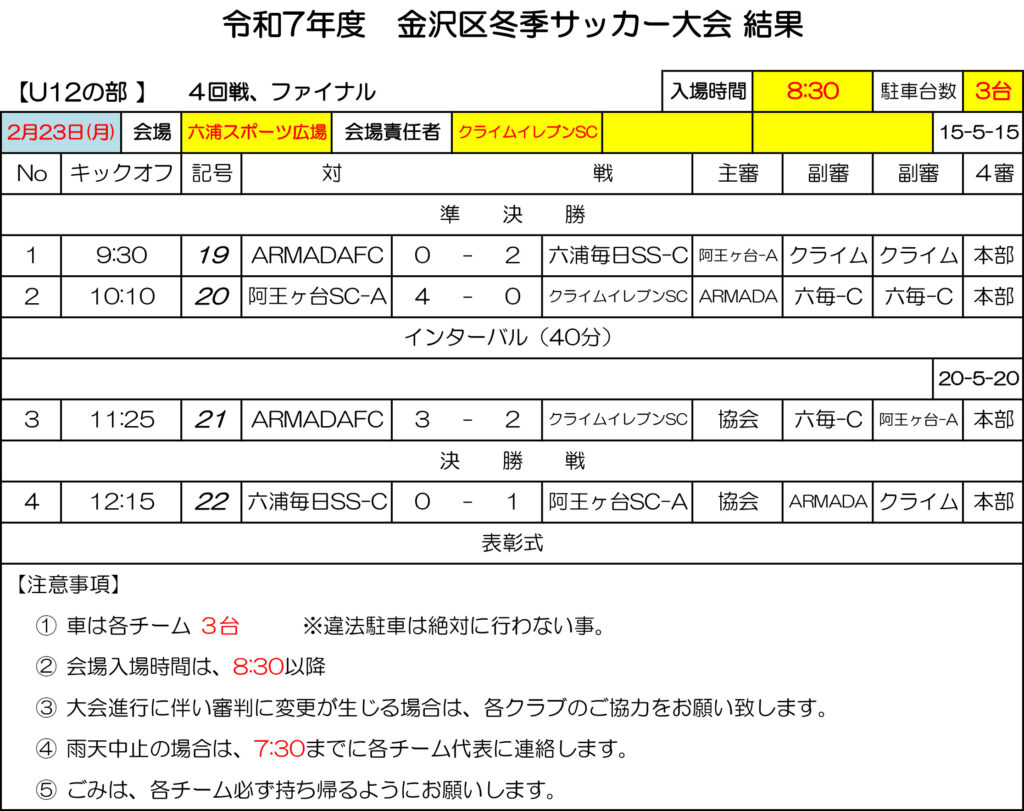 金沢区冬季サッカー大会U12 準優勝 2026 2/24 活動記録 U12 お知らせ 2026年2月24日 U12クラスが金沢区冬季サッカー大会で準優勝しました! たくさんの応援ありがとうございました。 活動記録 U12 お知らせ info よかったらシェアしてね! URLをコピーしました! URLをコピーしました! 3月のスケジュールをアップしました 関連記事 3月のスケジュールをアップしました 2026年2月24日 2月のスケジュールをアップしました 2026年2月7日 1月のスケジュールをアップしました 2025年12月22日 緑区少女サッカー大会 U-10 優勝 2025年11月27日 日大藤沢高校 有川啓介君 全国大会出場壮行会 2025年11月27日 12月のスケジュールをアップしました 2025年11月27日 11月のスケジュールを更新しました 2025年10月28日 【中止連絡】10/26(日)キッズイベント 2025年10月25日